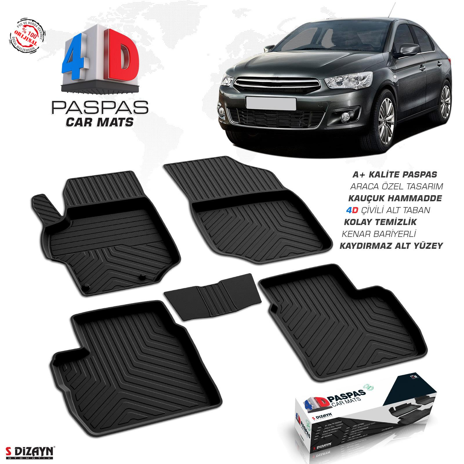 p>Araca Özel 4D Havuzlu PaspasÜrün araca özel olarak en yüksek kalite seviyesinde Avrupa OEM (Original Equipment Manufacturer) kalite standartlarında üretilmiştir.Ekolojik, doğayla dost, geri dönüştürülebilen malzemeden imal edilmiştir.-50°C'den +80°C ısıya kadar yüksek dayanıklılığa sahip gerçek kauçuk ham maddeden imal edilmiştir.Şeklini asla kaybetmez.Havuz kenarlarında bozulma yapmaz.Kaymaz çivili özel 4D alt tabana sahiptir.Sabitleme yuvalarına sahiptir (Bazı araçlarda model bazlı farklılık gösterebilir).Aracınıza bire bir özel olarak imal edilmiştir.3-4 cm yüksekliğinde havuzlu yüzeylere sahiptir.Şaftı örten ayrı bir parçası vardır. (Şaft parçası olmayan araçlarda ortada birleşmektedir)Aracınızın taban döşemesinde oluşacak kalıcı lekelere karşı etkin koruma sağlar.Su ile kolayca temizlenir.Araca göre özel sol ayak dayama dili ve pedal altına giren şekliyle sürüş güvenliğini temin eder.Manuel ve otomatik araçlarda farklılık göstermez.Ön/arka set fiyatıdır.Uluslararası kalite standartlarına uygun olarak , yüksek teknoloji ile gerçek kauçuk kullanılarak imal edilmiştir.High Qualltiy Car Mat's ISO 9001:2008 ISO/TS 16949:20093D havuzlu paspas ile 4D havuzlu paspas arasındaki fark nedir ?3D havuzlu paspas PVC ham madde kullanılarak vakum tekniği ile üretilir. Sadece üst tek yüzeye sahiptir. Ortalama ürün ağırlığı 3-4 kg'dir.4D havuzlu paspas kauçuk ham madde kullanılarak pres baskı tekniği ile üretilir. Çivili alt ekstra yüzeye sahiptir. Ortalama ürün ağırlığı 6-8 kg'dir.