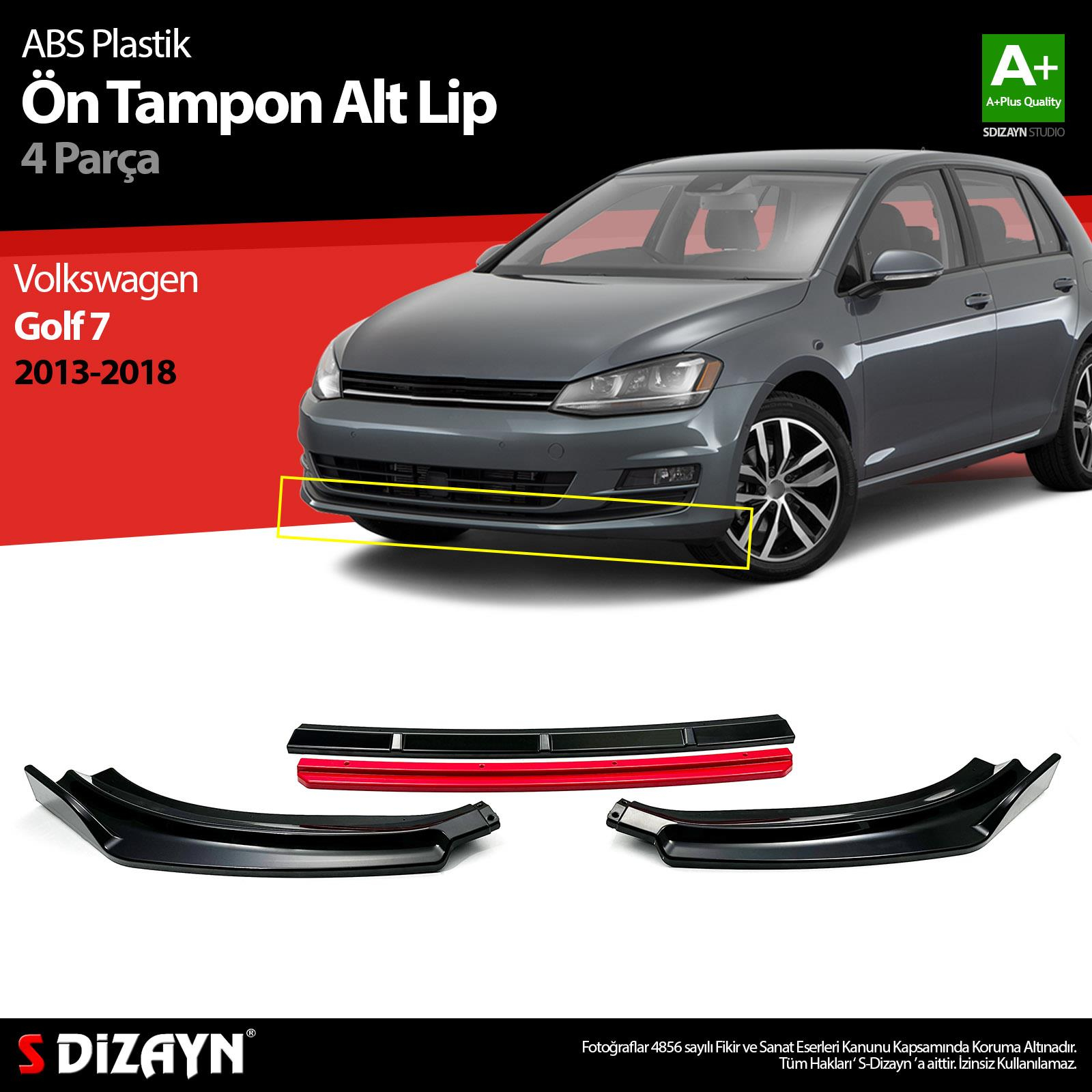 S-Dizayn VW Golf 7 ABS Plastik Ön Tampon Alt Lip Kırmızı Ekli 4 Prç. 2013-2018 A+Kalite